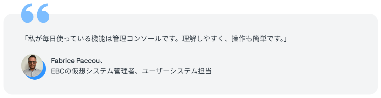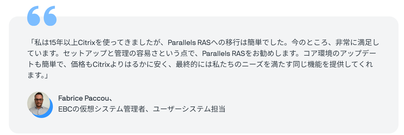「概念実証の段階では、移行対象のVDIがParallels RASで問題なく動作するかどうかが、実行可否の判断基準でした。CitrixとParallels RASを並べて比較することで、容易に比較することができました」と、EBCのユーザーシステム担当仮想システム管理者であるファブリス・パックー氏は述べています。「Autodeskソリューションを頻繁に利用するエンドユーザー数名をParallels RASに移行したところ、応答は良好だったとのことです。CitrixはHDXプロトコルを使用していますが、Parallels RASは使用していないため、この点については満足しています。」