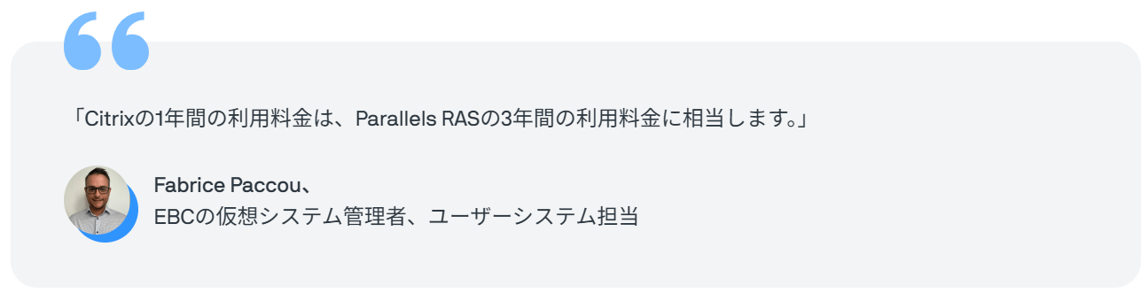さらに、EBCチームはCitrixからParallels RASに切り替えることでコスト削減を実現しました。