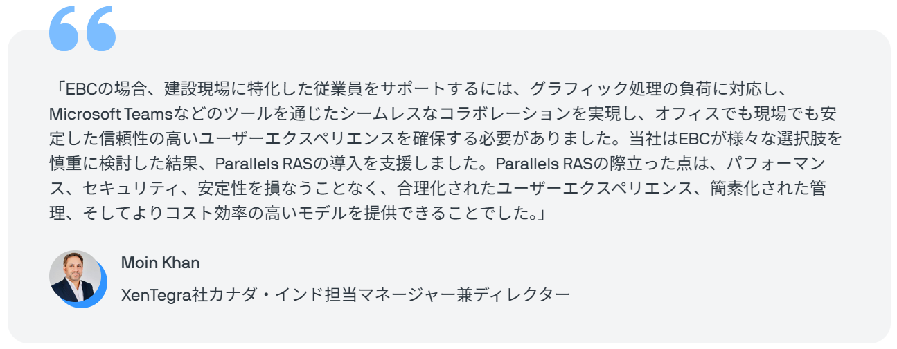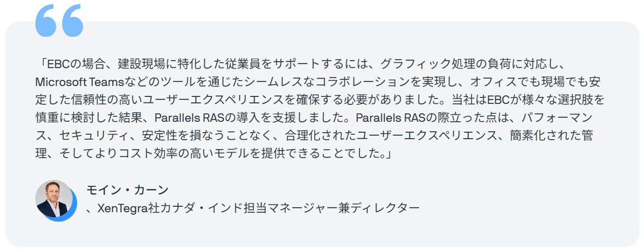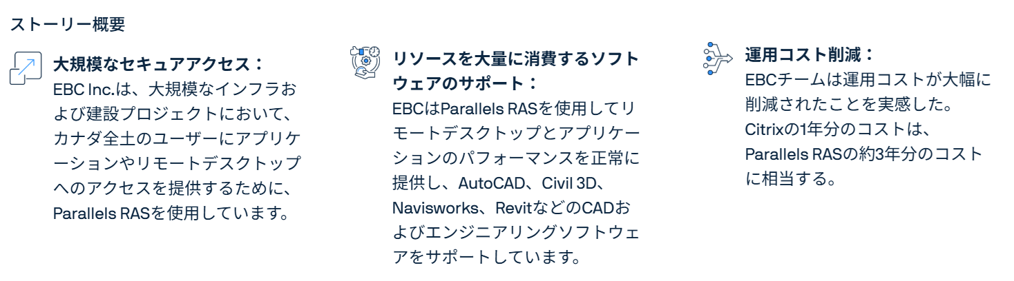 Citrixで得られた結果と同等の良好なユーザーエクスペリエンスに加え、Parallels RASはEBCチームが必要とする様々な基準を満たすことができました。