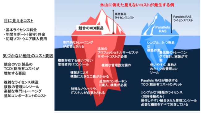 ITシステムや機器の導入から廃棄までに掛かる費用(初期・ランニングコスト)である総額総所有コスト(TCO)を評価することは、実は、氷山を見ているようだと私たちは考えます。氷山の表面より下にあり隠れている要素は、ユーザー1人当たりのコストに大きな影響を与えます。TCOは単なるライセンス費用以上のものを含んでいるからです。ベースの運用コストや、運用支援に関わる間接的なコストが全体の投資に占める割合が次第に大きくなり、運用開始後、時間とともに、運用に必要なリソース配分に影響を与えます。そのためVDI環境を導入、運用されるユーザーの皆様は、ライセンス取得時のイニシャルコストだけでなく、同時に表面下で、追加のコストが発生していることを認識しなければいけません。